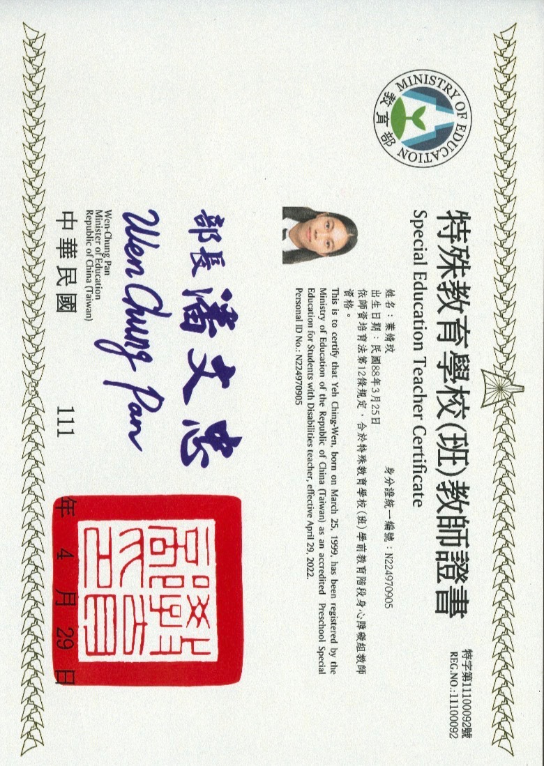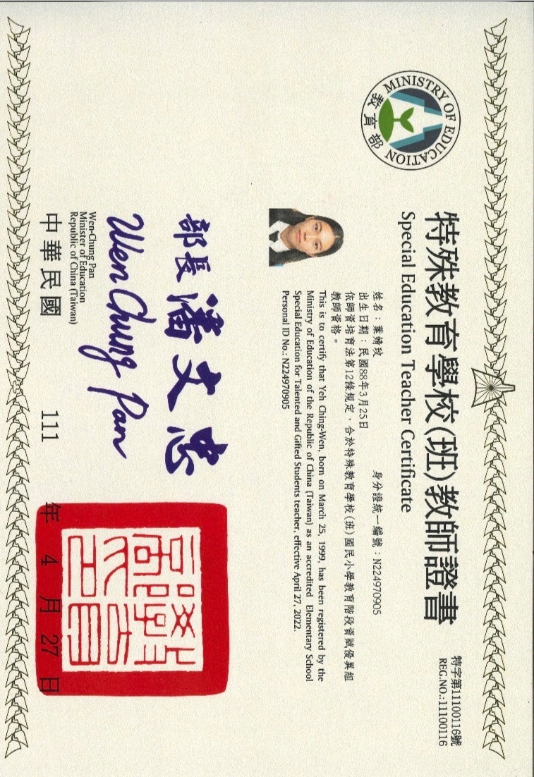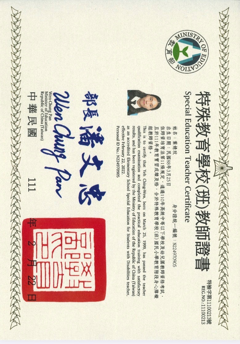我是一名擁有三張教師證的特教老師,分別是國小身障、國小資優以及學前身障,自從投入教育後,就不斷思考,什麼樣的教育才可以真正讓孩子成長,我走過國小、私人一對一課程、學前園所輔導以及協助海外家庭,我發現重要的從來不是教導學科知識,而是能用一輩子的能力,挫折容忍、問題解決、情緒覺察、同理他人及社會參與,我希望能影響更多的家庭以及老師,不僅給予孩子更大的彈性,也學習如何先照顧好自己,才能有餘裕的和孩子培養關係。